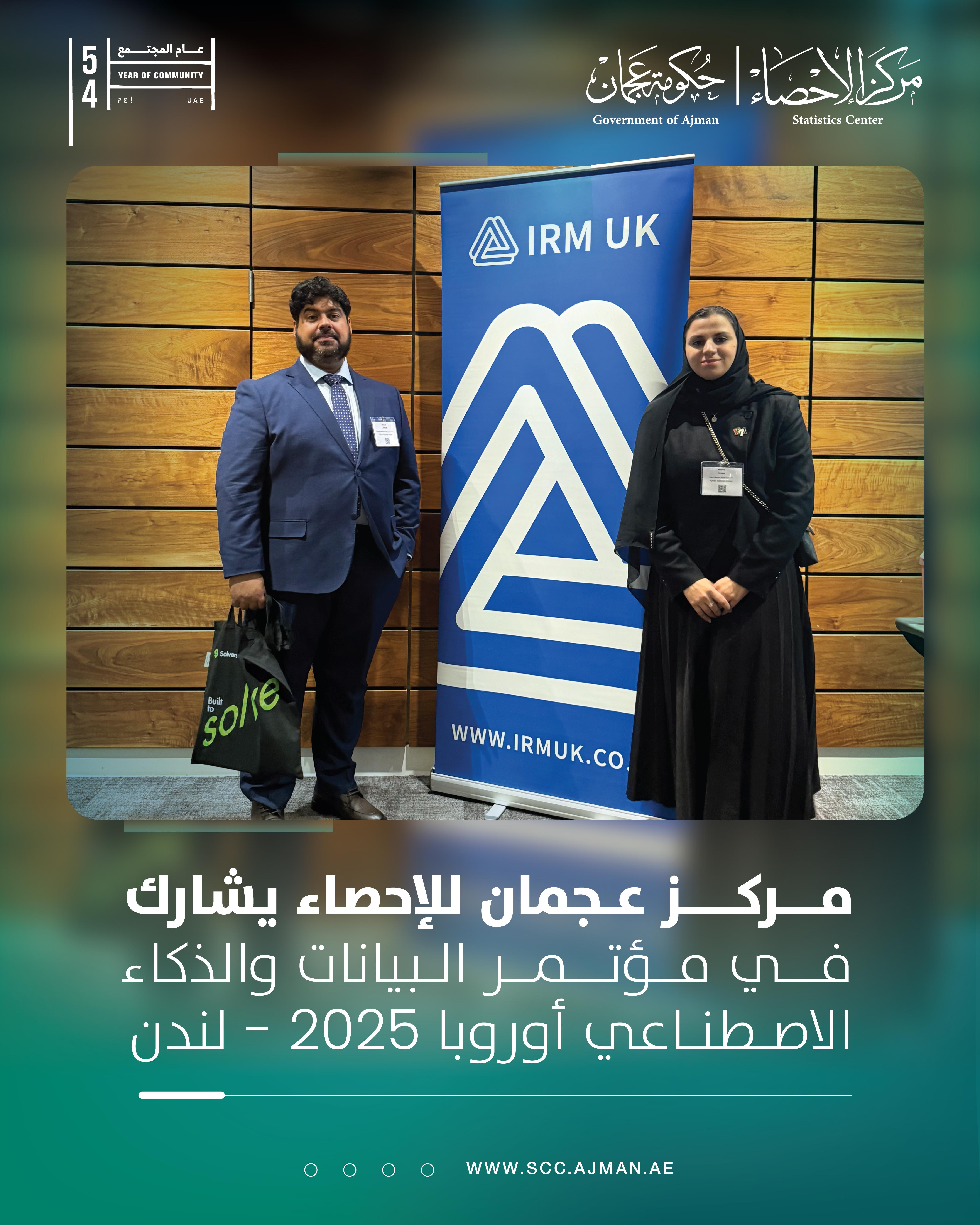 An official delegation from the Ajman Statistics Center participated in the Data and AI Conference – Europe 2025, held in London from October 13 to 17, 2025. The event brought together a distinguished group of global leaders and experts in data and smart technologies from around the world. Recognized as one of Europe’s premier specialized events, the conference explored the latest advancements and emerging trends in data management, AI ethics, machine learning, and advanced analytics. Participants also reviewed global best practices in harnessing artificial intelligence to support decision-making and accelerate digital transformation across both public and private sectors. The participation of the Ajman Statistics Center came through an official delegation representing Dr. Hajar Al Habishi, Director General of the Center. This engagement reflects the Center’s commitment to representing the Emirate of Ajman at international specialized forums and to fostering knowledge exchange and collaboration with leading global institutions in the fields of data and statistical analysis. During the event, the delegation was introduced to cutting-edge technologies and innovative solutions in big data analytics and intelligent system development. The team also held side meetings with representatives of several international organizations to discuss potential collaborations and exchange expertise in strengthening statistical infrastructure and promoting data-driven innovation. Dr. Hajar Al Habishi emphasized that the Center’s participation in this global event is part of its ongoing efforts to stay abreast of international developments in data and artificial intelligence. She noted that leveraging global best practices contributes to the advancement of Ajman’s statistical ecosystem and supports the Emirate’s digital transformation and innovation journey in line with the Ajman Government Vision 2030.